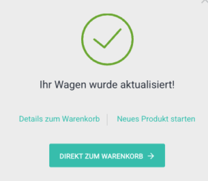 Nun können Sie über den Button „Direkt zum Warenkorb“ zu Ihrem Warenkorb gehen oder über das „x“ rechts oben das Fenster schließen und über „Zurück zum Shop“ auf die Produktseite zurückgehen.