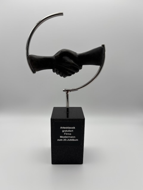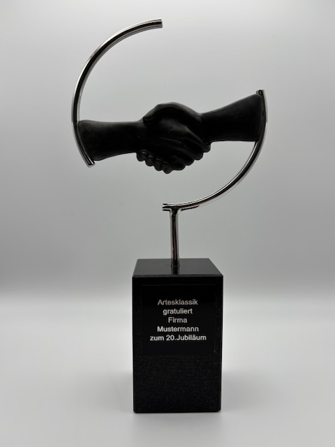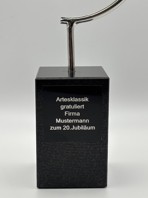 Als exklusiver Online Shop für Kunst Skulpturen haben Sie bei uns die Möglichkeit, die gewählte Skulptur entsprechend Ihrem Anlass zu personalisieren. Dazu können Sie eine persönliche Botschaft in Form eines Textes auf das gewählte Präsent anbringen. Wir lassen dann entsprechend ein schwarzes Gravurschild in goldener oder silberner Schrift anfertigen – je nachdem, was am besten zu dem Sockel Ihrer Skulptur passt.