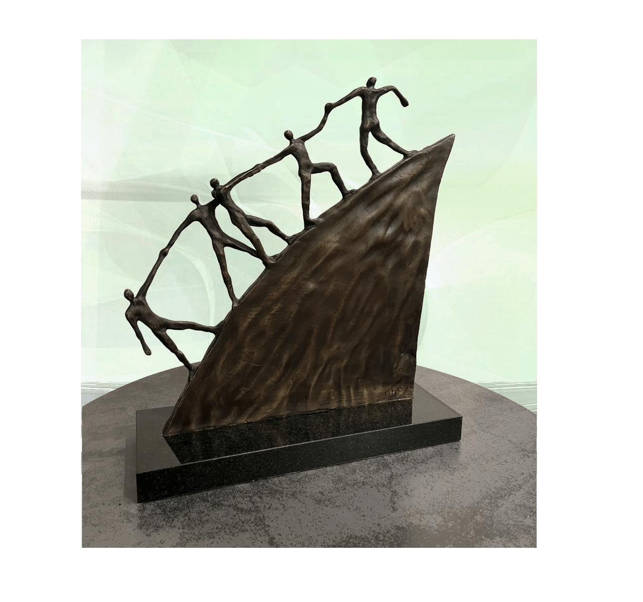 Die einzigartige Skulptur bezeichnet einen innovativen Unternehmensfortschritt, der nur mit vereinten Kräften und entschlossenen Schritten erreicht wird.