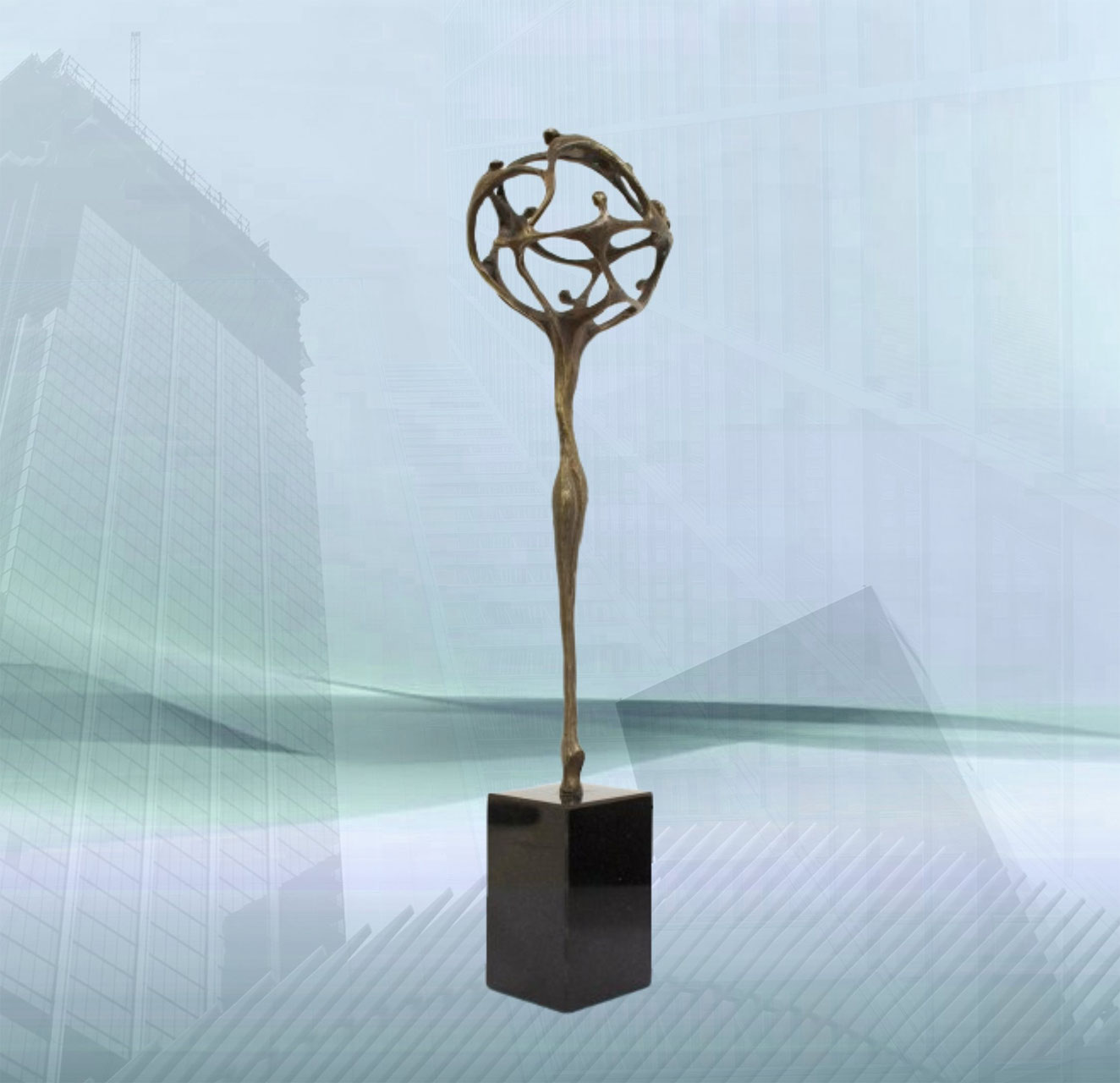 Getreu dem Motto „durch neue Dimensionen zur Veränderung“ zeigt das stilvolle Bronzekunstwerk das Maß auf, in dem Innovation zum entscheidenden Erfolgsfaktor wird, wenn die Ausrichtung dynamischer Teamarbeit in einem engen Netzwerk, das von Inspirationen geleitet und gefördert wird, zielgerichtet umgesetzt wird.